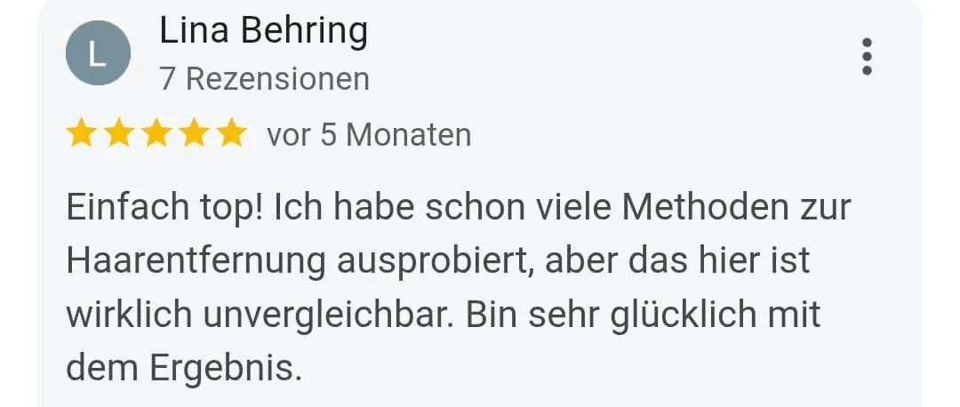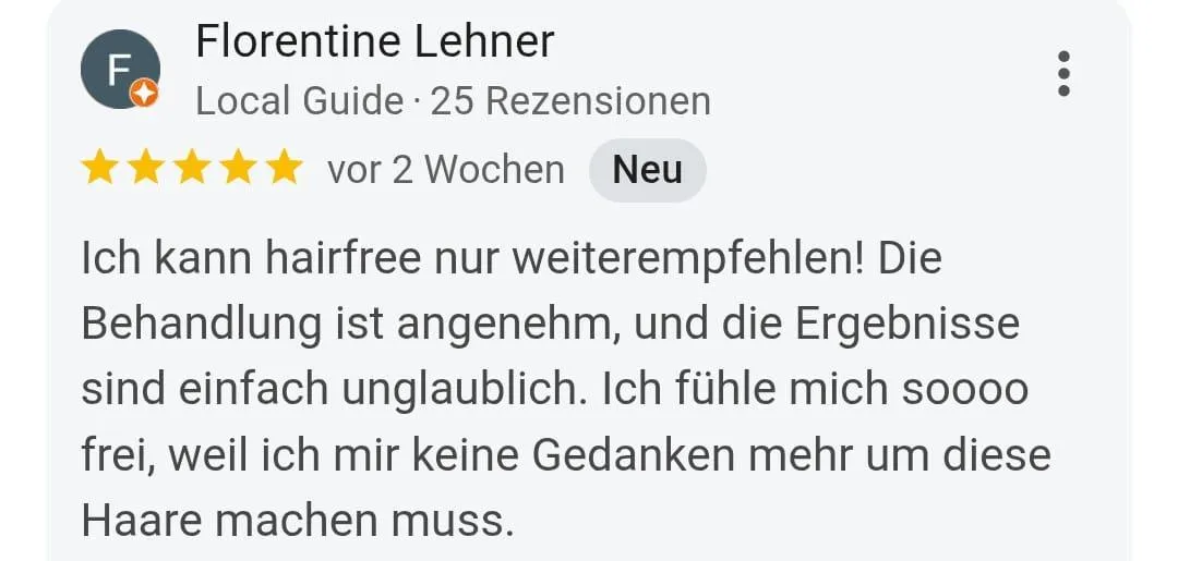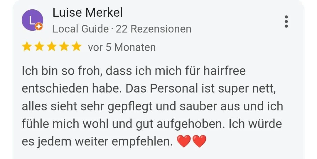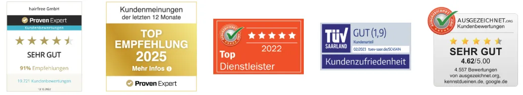 *) Bei der Haarentfernung oder Enthaarung wird unterschieden zwischen temporärer (Depilation) und dauerhafter (Epilation) Haarentfernung. Dauerhafte oder permanente Haarentfernung wurde von der FDA (Food and Drug Administration USA) definiert als „signifikante Haarreduktion für einen Zeitraum, der länger ist als ein Haarzyklus in der entsprechenden Körperregion andauert“. Aus eigener Erfahrung haben wir eine hohe Erfolgsquote bei der dauerhaften Haarentfernung ¹. Jedoch kann die Behandlung in Ausnahmefällen nicht zum gewünschten Ergebnis der Dauerhaftigkeit führen. Aus medizinischer Sicht ist ein Hauptproblem bei der dauerhaften Haarentfernung ¹ dann gegeben, wenn z.B. die zu behandelnden Haare hell und nicht pigmentiert sind. Dies ist meist bei hellblonden, weißen, grauen und roten Haaren der Fall. Ein weiteres Beispiel der häufigen Ineffizienz von dauerhaften Haarentfernung ¹sbehandlungen zeigt sich bei dem Krankheitsbild „Hirsutismus„. Menschen mit dieser Krankheit leiden an meist überdurchschnittlich starkem Haarwuchs, der auch erfolgreich behandelt werden kann. Auch hormonelle Umstellungen im Körper können dazu führen, dass auch nach der abgeschlossenen Behandlung weiterhin Haare wachsen können. hairfree arbeitet überdurchschnittlich erfolgreich und verfügt über eine hohe Kundenzufriedenheit.